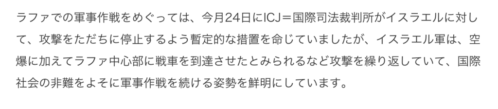 Japanese Translation: Over the military oeration in Rafah, on 24th today, ICJ ruled out to halt the “attack” immediately but IDF has been air striking and, in the middle Rafah, deployed tanks and repetitively attacking (civilians, which is totally untrue) and Israel is ignoring the condemnation from the international society and making it obvious that the nation will continue military operation.