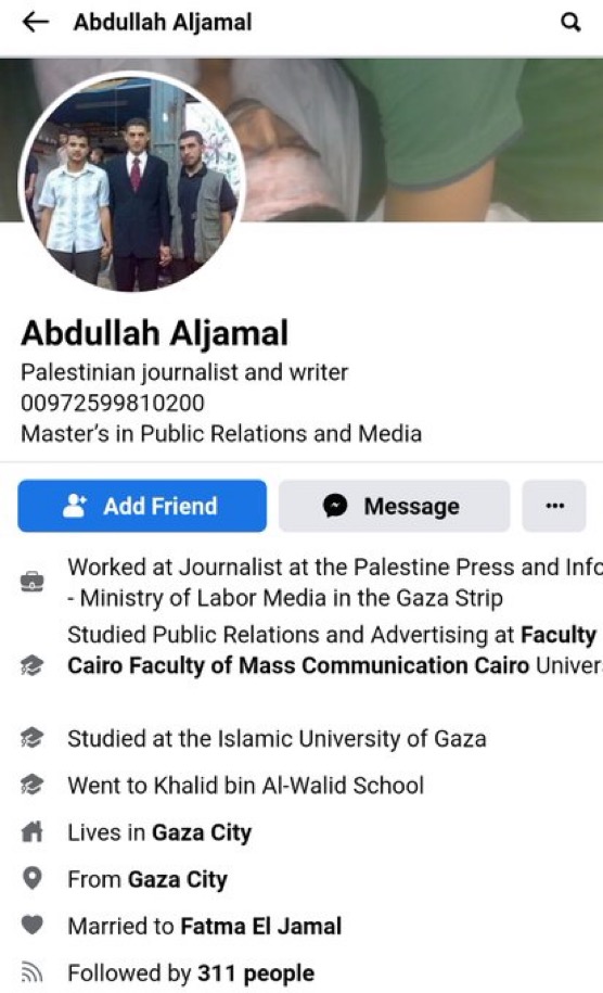 او آرزوی مرگ تمام اسرائیلی ها را به Gd کرد این چهره روزنامه نگارانی است که از غزه به عنوان اهل اخلاق به جهان گزارش می دهند. ابودالله الجمال صفحه فیس بوک دارد که نمایه او را می گوید.